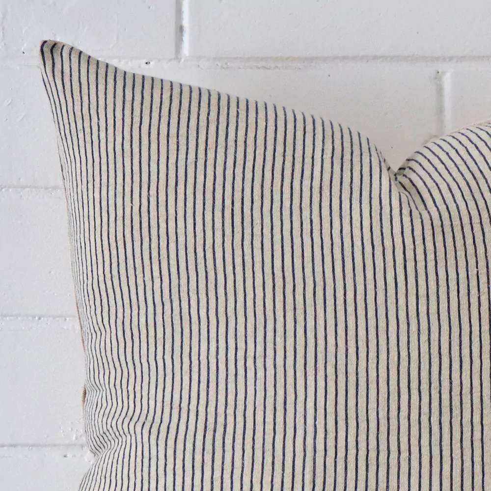 Simple navy ticking stripes on a cream textured cotton make this cushion a simple yet striking piece.