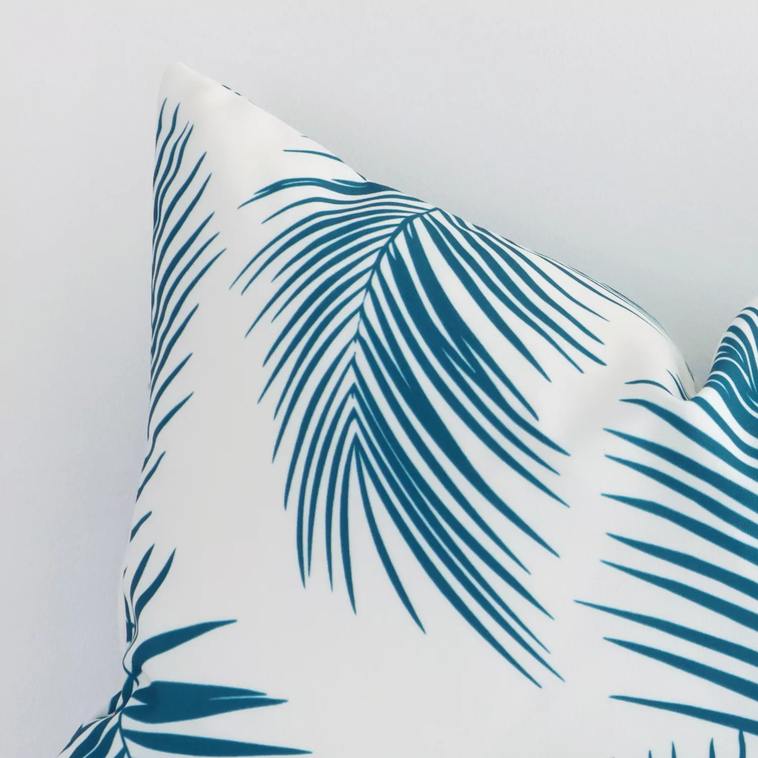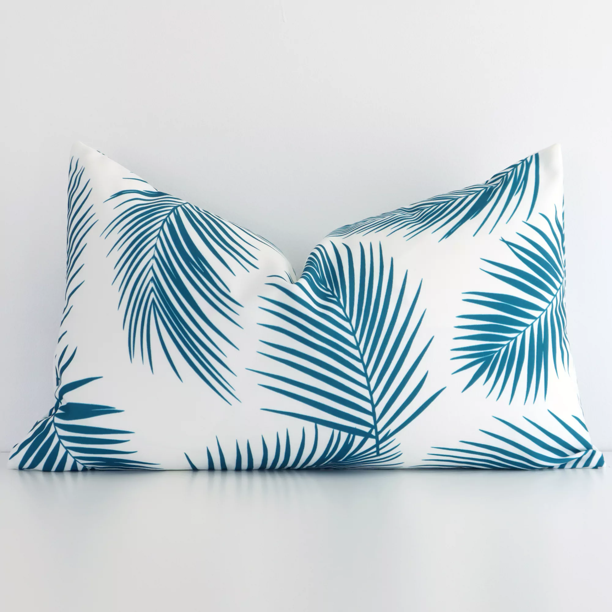 Create some vibrancy with tropical palm tree leaf prints in bright teal and white tones for a splash of sophistication. Fun and playful, this weatherproof teal rectangular outdoor cushion is reminiscent of lush lagoons and shallow tropical waters.
