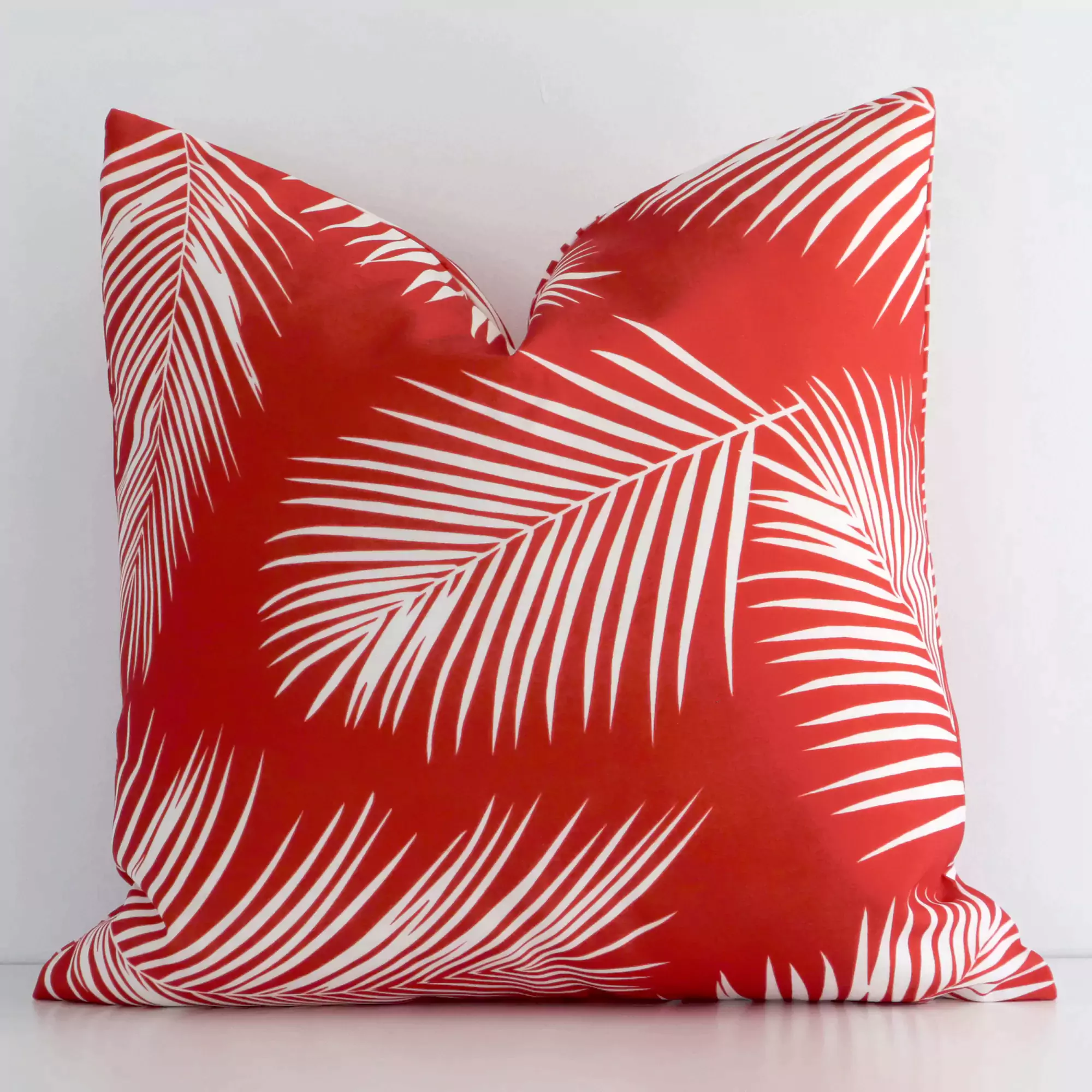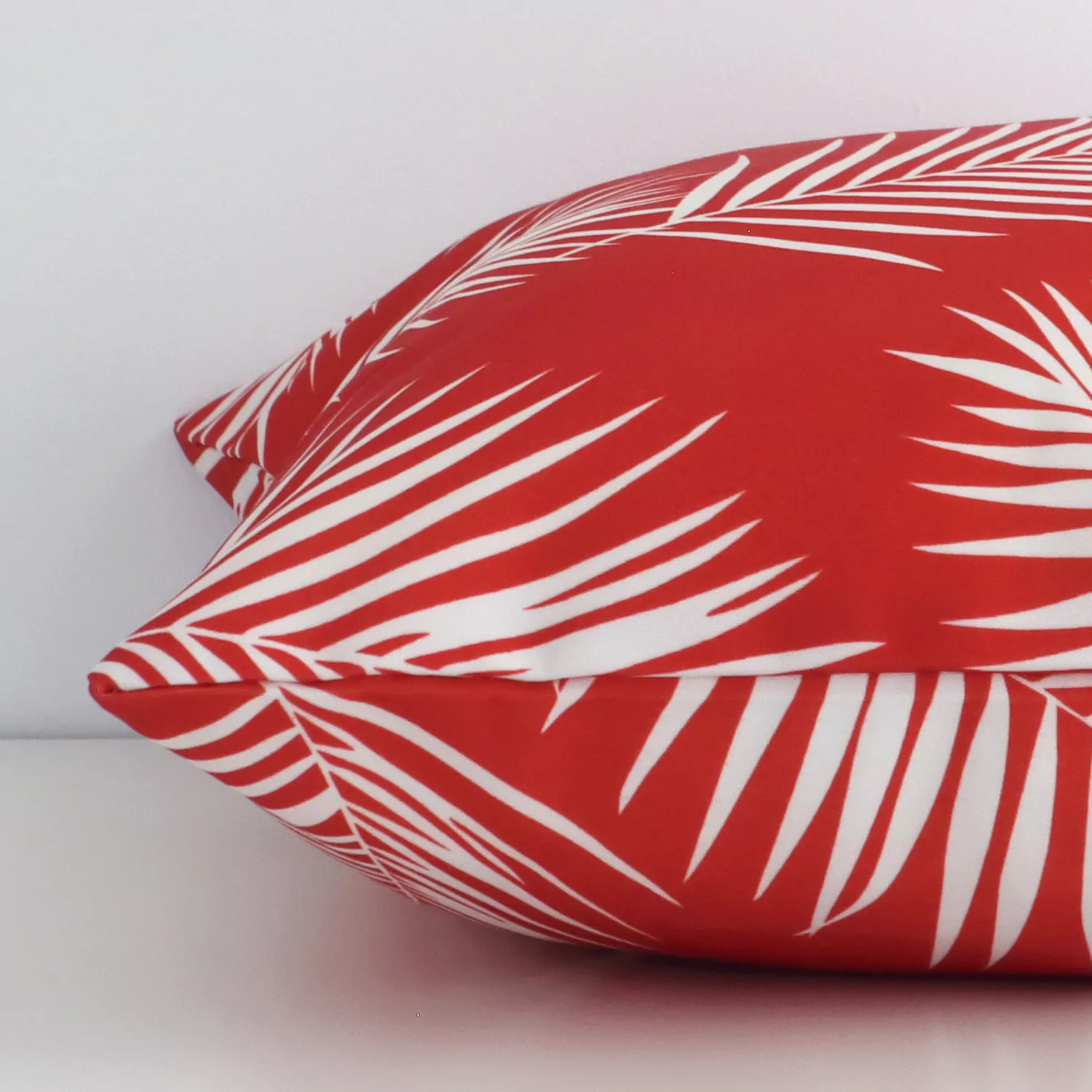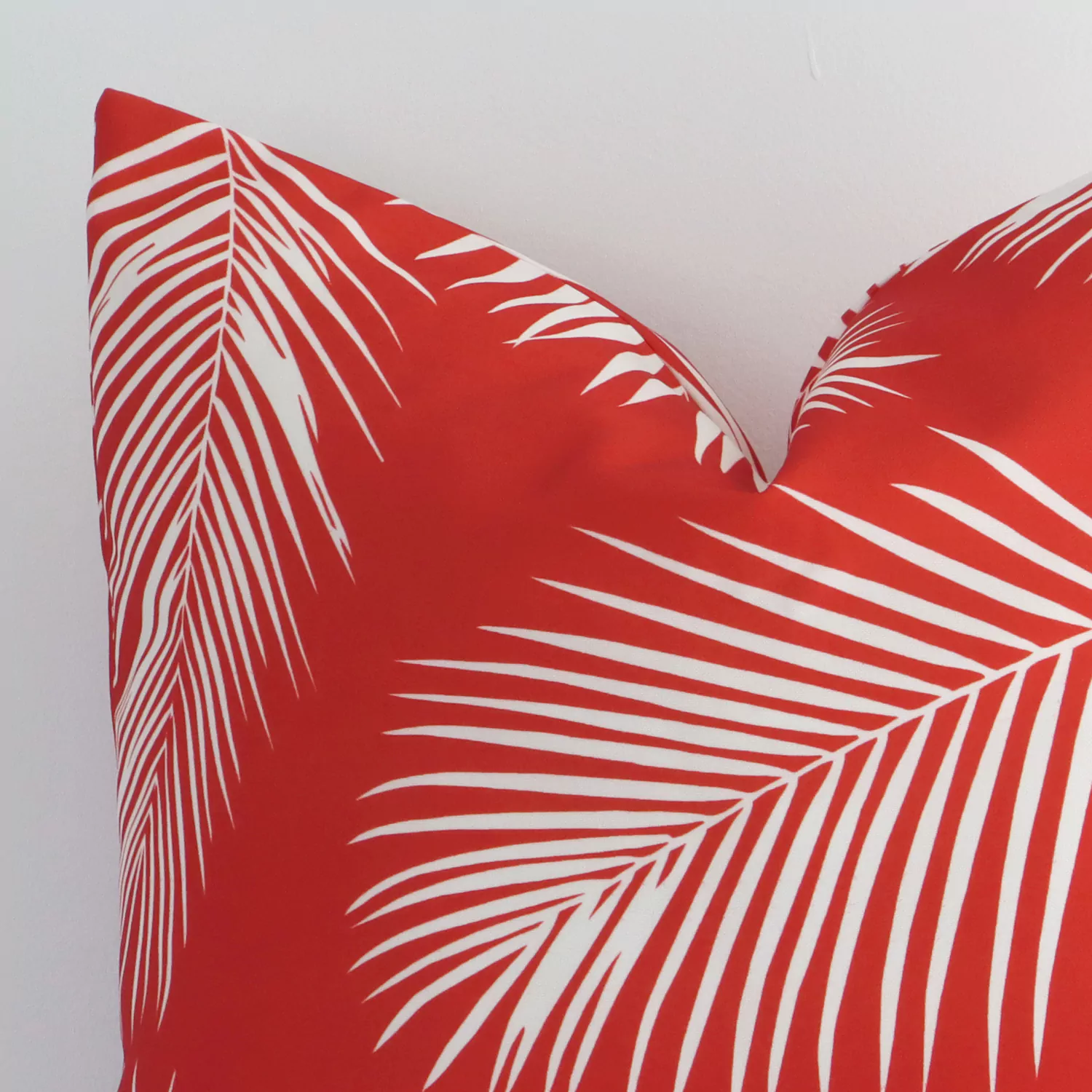 Bold red hues illustrate a fresh springtime palette, particularly when teamed with bright and crisp white tones. Invite tropical palm tree leaf patterns into your space with this weatherproof red outdoor cushion cover, perfect for creating a tropical-inspired theme.
