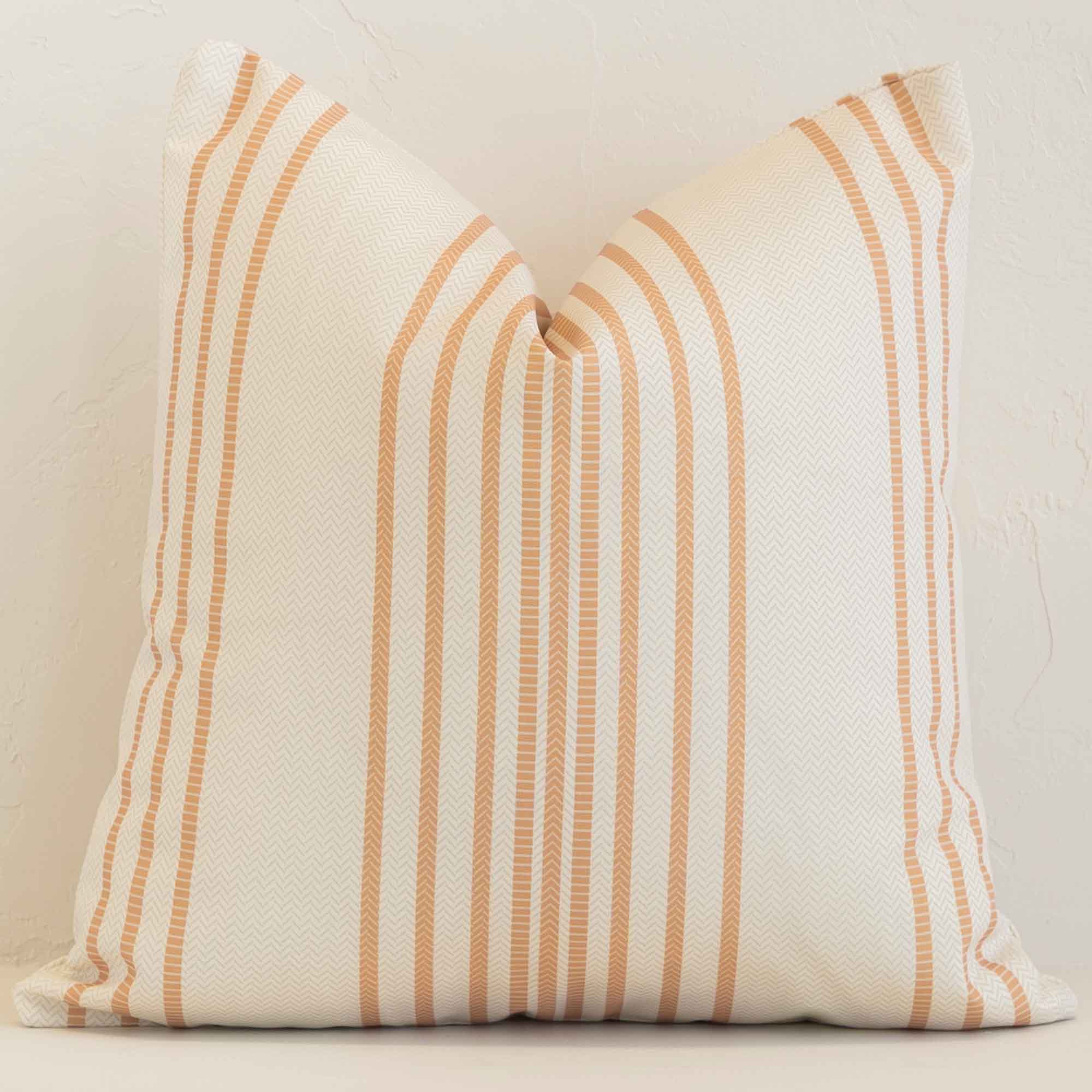 The Desert Bloom Waterproof Striped Outdoor Cushion Cover features warm peach and cream stripes with a subtle herringbone texture, bringing a soft yet vibrant accent to your outdoor décor. Made with durable, water- and UV-resistant fabric, it’s ideal for all-weather lounging.