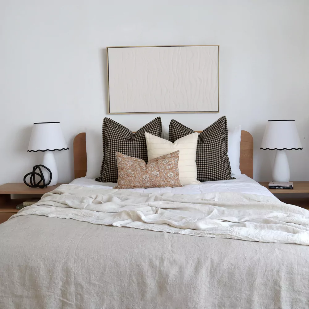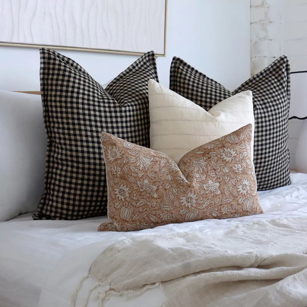 Our Finn 4 Bed Cushions Set exudes a cosy, rustic charm, blending warm earthy tones with the deep, comforting checks and subtle stripes.