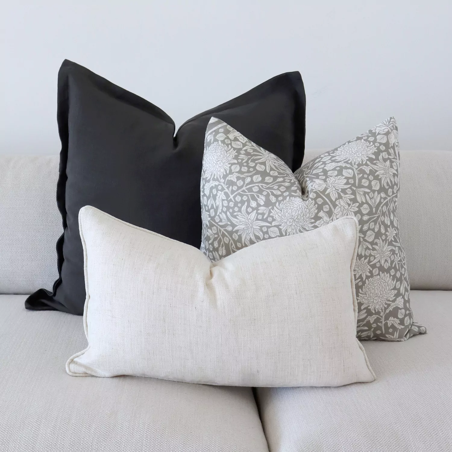 Wondering how to expertly combine cushions for a beautifully styled space? Look no further than our Gracie Linen Grey Floral Cushion Cover in rectangle. Pair this lovely cushion with a square linen block and a simple stripe design and you'll achieve a professionally styled look that's sure to impress.