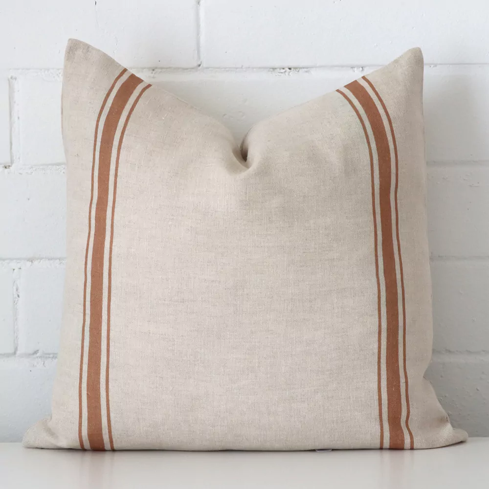 Say hello to our Ivy Linen Terracotta Striped Cushion Cover! Made from soft natural linen with a simple yet bold stripe design, this cushion will instantly uplift your home and at a fraction of the cost of other home decor efforts.