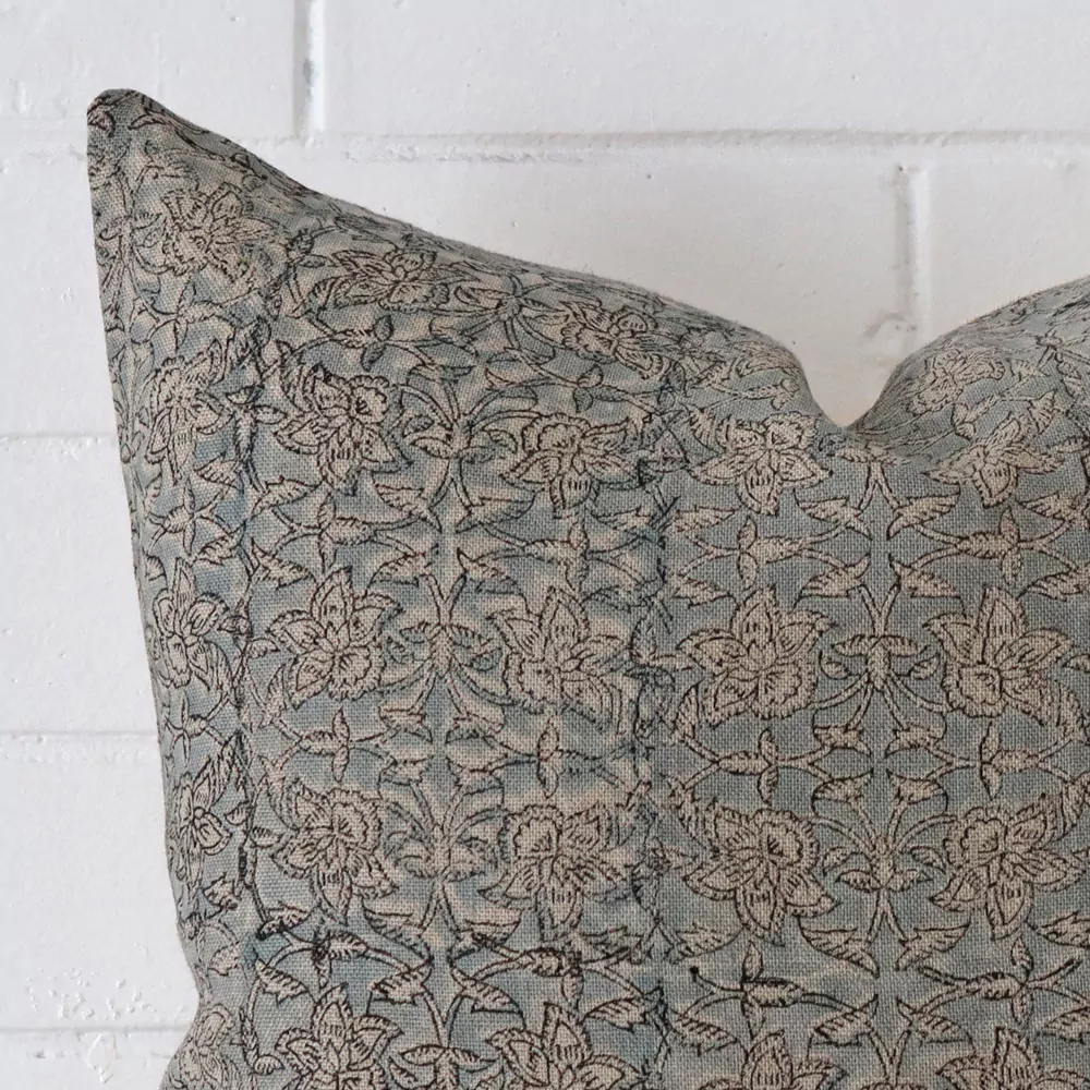 Crafted from 100% linen, the front fabric serves as a canvas for intricate hand block-printing from India using traditional methods.