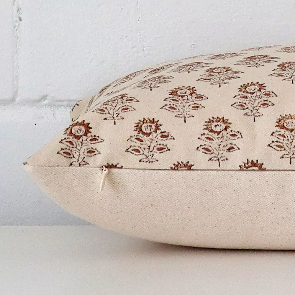 The front fabric undergoes meticulous hand block-printing in India on 100% linen using age-old techniques.