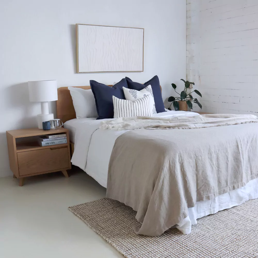Each piece, from the bold navy solids to the elegantly patterned whites, is lovingly crafted from the finest linen. Our natural linen is renowned for its breathability and softness AND its machine washable! So you can enjoy a little breakie in bed!