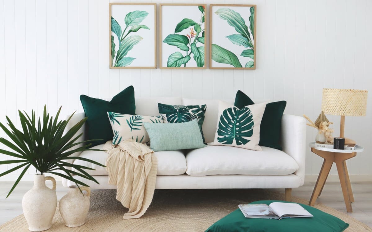 A set of cotton linen cushions feature in a room that has a beach theme.