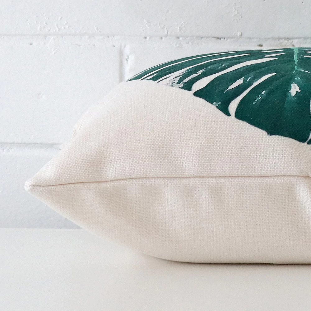 Inducing a breezy feeling, this tropically inspired cotton linen green leaf cushion cover will have you thinking of summer days at the beach. Perfect for any space, light or dark.