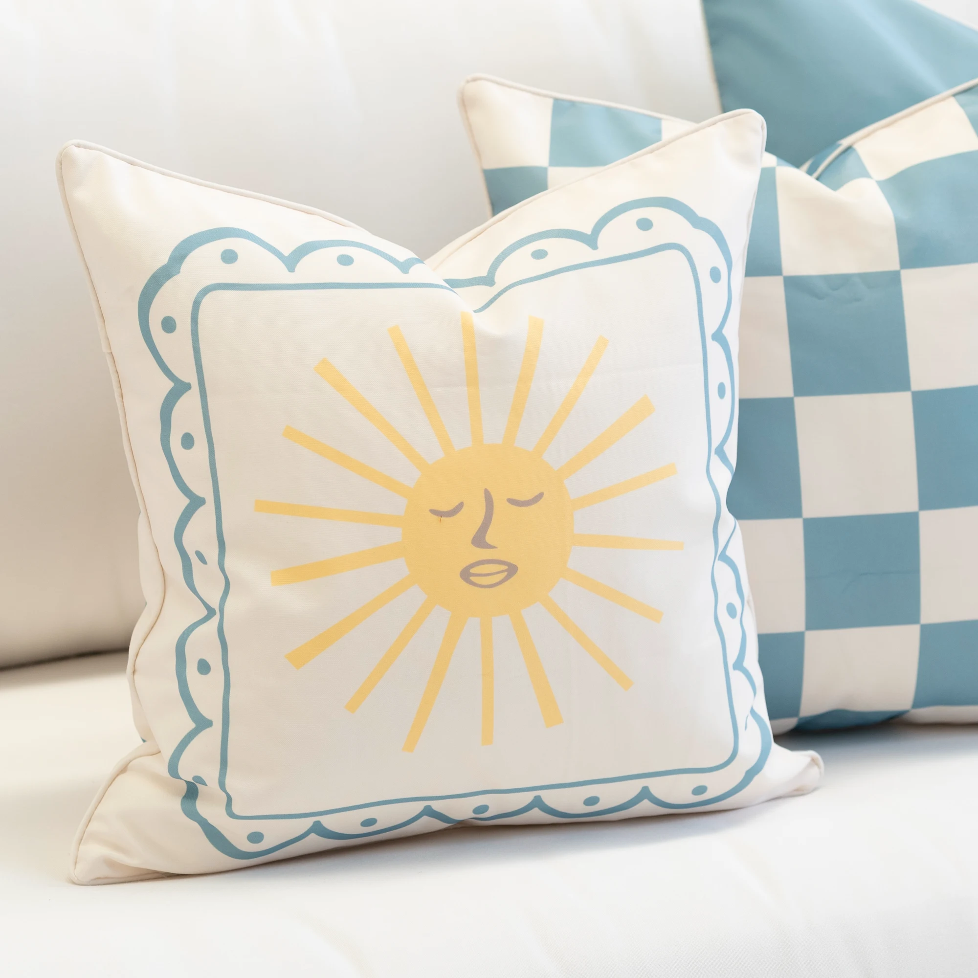 Refresh your outdoor lounge with the Tropica Aqua Cushion Set of 3. Pre-styled for easy impact, this combination of playful motif, soft check and solid aqua brings a relaxed, coastal feel to your seating. Made from UV- and water-resistant outdoor fabric, it’s designed for everyday outdoor living with lasting style.